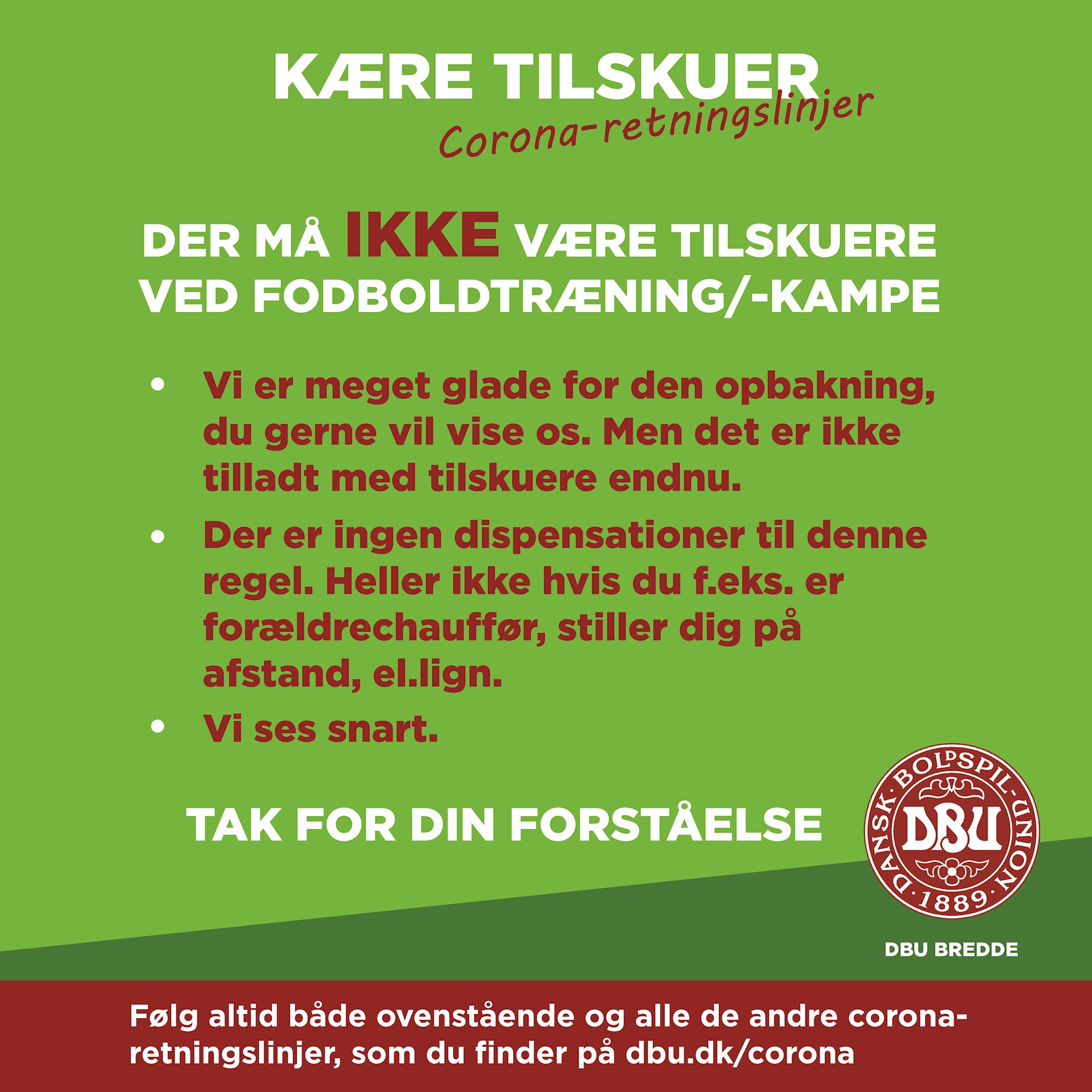 • Ingen tilskuere til træning eller kampe - heller ikke forældrechauffører